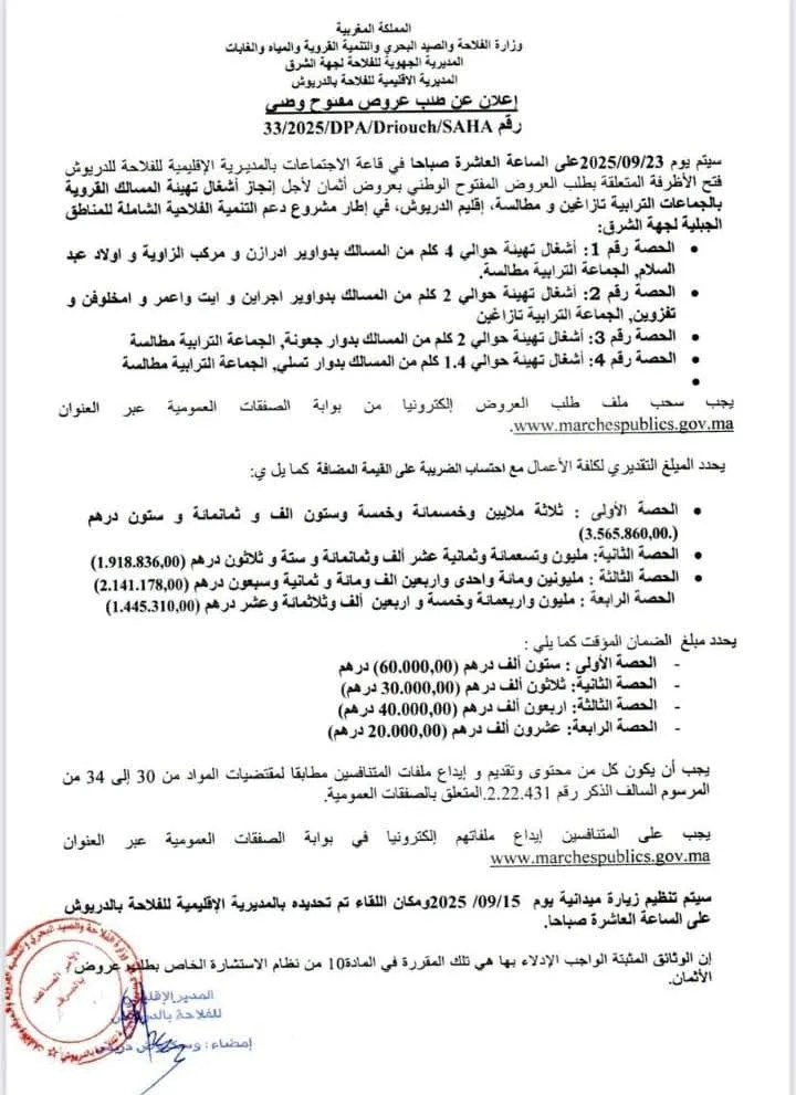 في الوقت الذي يعلّق فيه سكان إقليم الدريوش آمالاً عريضة على مشاريع البنية التحتية لفك العزلة وفتح المسالك الطرقية، خرجت المديرية الإقليمية للفلاحة بإعلان رسمي عن فتح الأظرفة لطلب العروض الوطني رقم 33/2025/DPA/Driouch/SAHA، المتعلق بتهيئة بضعة كيلومترات من المسالك القروية.