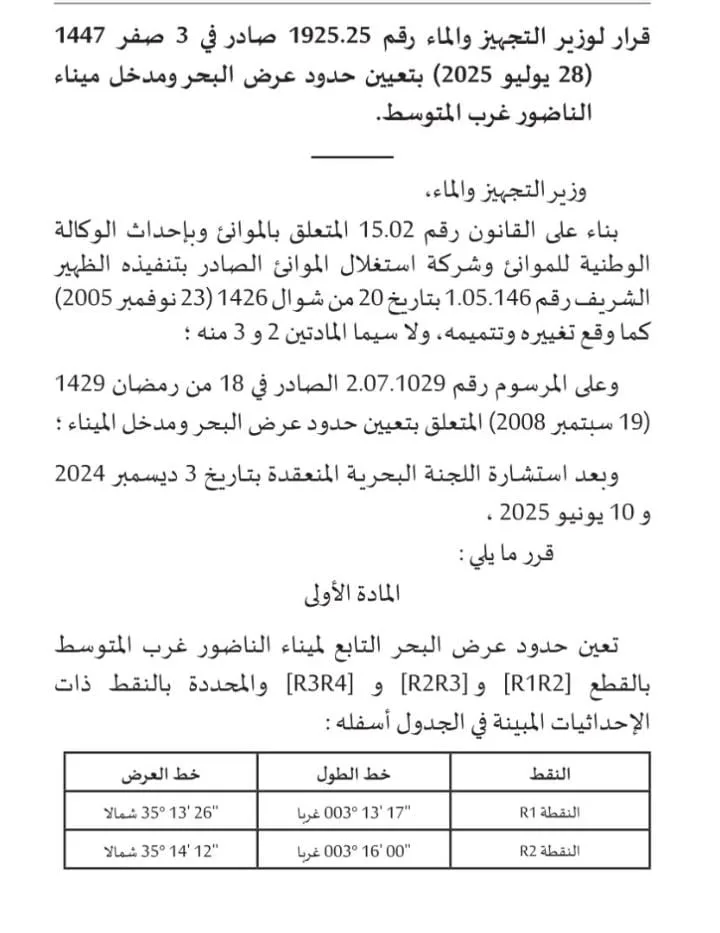 في لحظة تبدو تقنية في ظاهرها، لكنها عميقة الدلالة في جوهرها، أعلنت الحكومة عن قرار استراتيجي جديد يتعلق بميناء الناظور غرب المتوسط. فبمجرد نشر قرار وزير التجهيز والماء رقم 1925.25 في الجريدة الرسمية (عدد 7440 بتاريخ 28 يوليوز 2025)، والقاضي بتحديد الحدود الرسمية لعرض البحر ومدخل الميناء، يكون المغرب قد خطا خطوة إضافية نحو تثبيت حضوره البحري وتوسيع دائرة سيادته الاقتصادية في واحد من أهم المشاريع المهيكلة بالمتوسط.