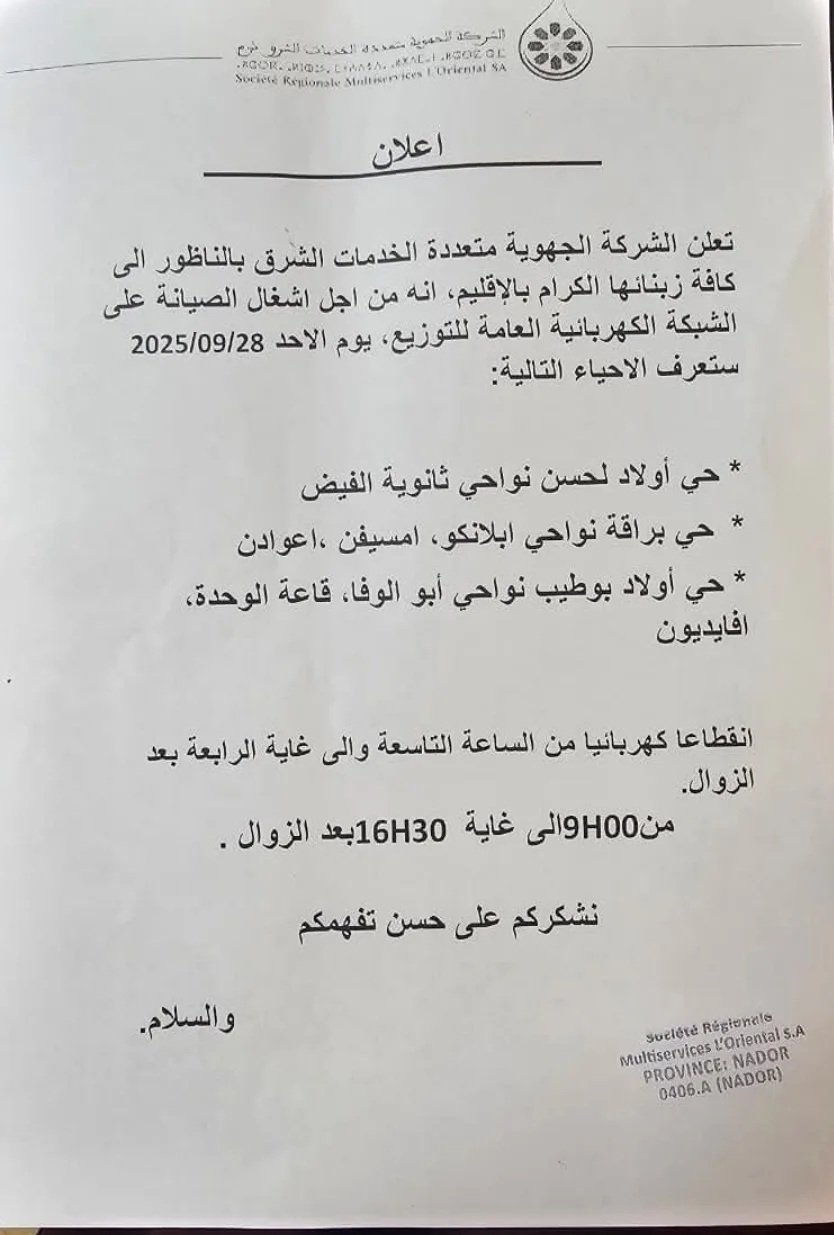 أعلنت الشركة الجهوية متعددة الخدمات الشرق بالناظور، أنها ستقوم بقطع التيار الكهربائي بعدد من أحياء المدينة يوم الأحد 28 شتنبر 2025، وذلك من أجل القيام بأشغال صيانة على الشبكة الكهربائية العامة للتوزيع.