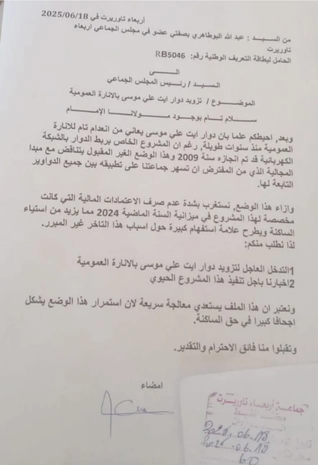 المستشار المعارض عبد الإله البوطاهيري أكد في هذا السياق أنه تقدم بتاريخ 18 يونيو 2025 بطلب رسمي يرمي إلى تزويد دوار أيت علي موسى بالإنارة العمومية، غير أن الطلب قوبل بالتجاهل التام من قبل الرئيس والمكتب المسير، معتبراً ذلك دليلاً واضحاً على غياب الجدية والمسؤولية في التعاطي مع احتياجات الساكنة.