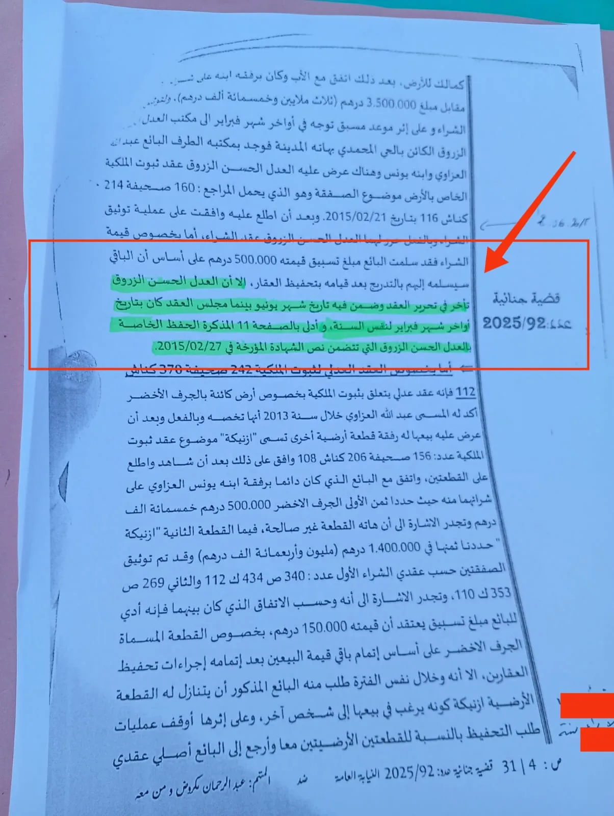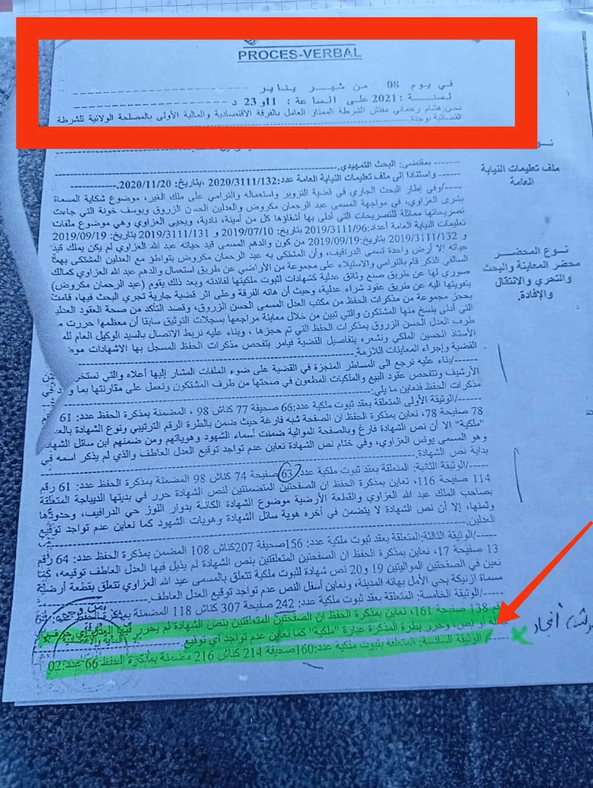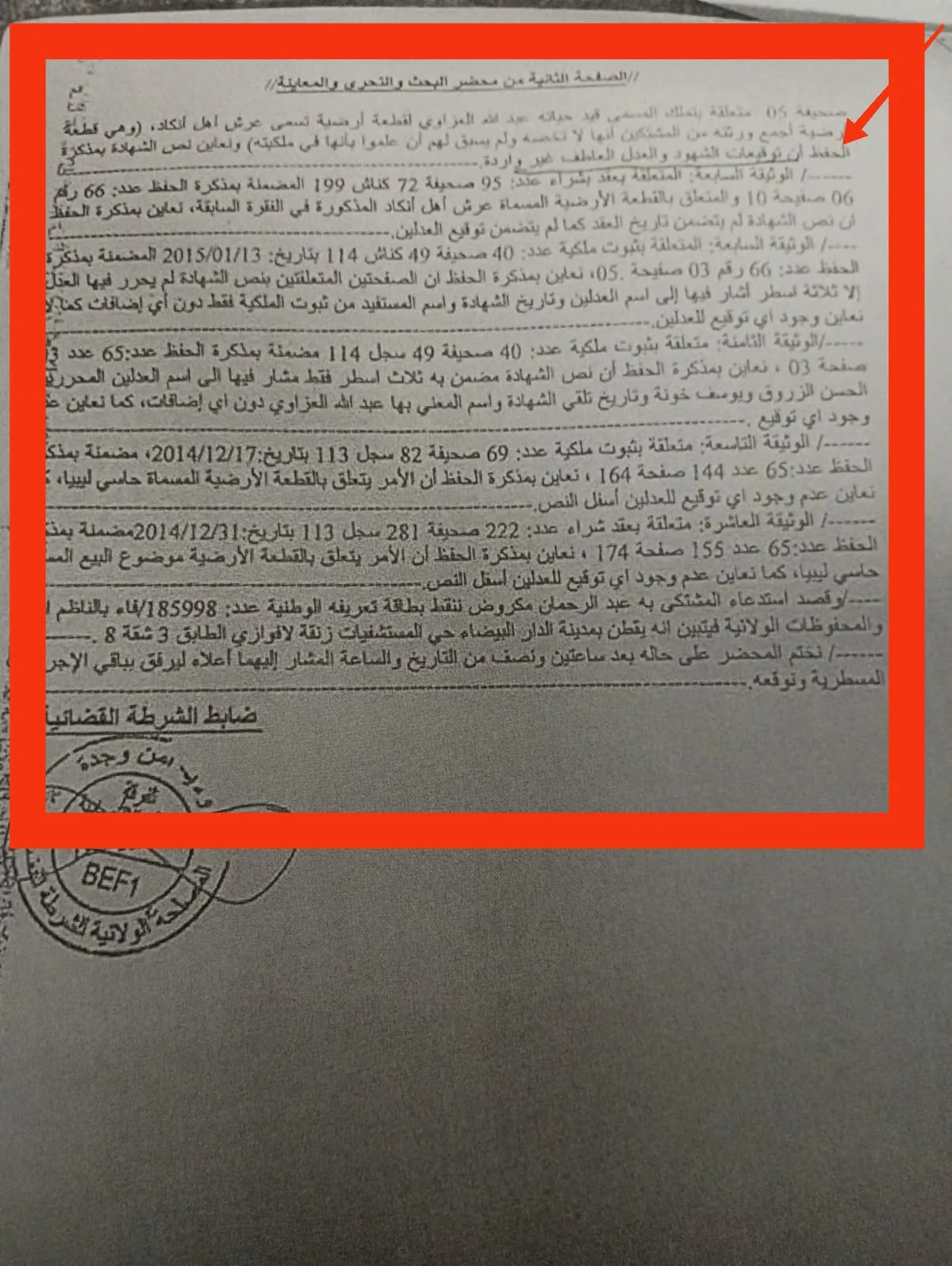 وتبرز المعطيات أن الشرطة القضائية أجرت بتاريخ 8 يناير 2020 معاينة دقيقة لمذكرات العدل، ليتضح أنها لا تتضمن أي تاريخ على نص الشهادة، كما أن الملكية العقارية المعنية تم توثيقها وتضمينها في سجلات المحكمة بتاريخ 2 يونيو 2015، ما يجعل تسلسل الأحداث مشوباً بتناقضات خطيرة قد تُعيد الملف إلى نقطة الصفر.