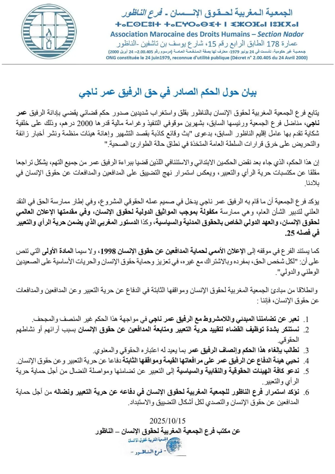 عبّر فرع الجمعية المغربية لحقوق الإنسان بالناظور عن قلقه إزاء الحكم القضائي الصادر في حق الناشط الحقوقي عمر ناجي، المكلف سابقًا بملحقة الاستثمار لعمالة الناظور والرئيس السابق لفرع الجمعية، والقاضي بإدانته بشهرين موقوفي التنفيذ وغرامة مالية قدرها 2000 درهم، وذلك بناءً على شكاية تقدّم بها عامل إقليم الناظور السابق.