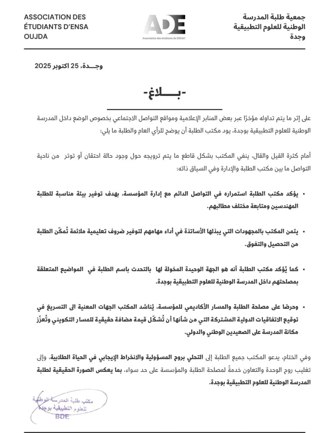 أصدرت جمعية طلبة المدرسة الوطنية للعلوم التطبيقية بوجدة (ADE)، يوم السبت 25 أكتوبر 2025، بلاغاً توضيحياً ردّت فيه على ما جرى تداوله في بعض المنابر الإعلامية ومواقع التواصل الاجتماعي بخصوص الوضع الداخلي للمؤسسة.