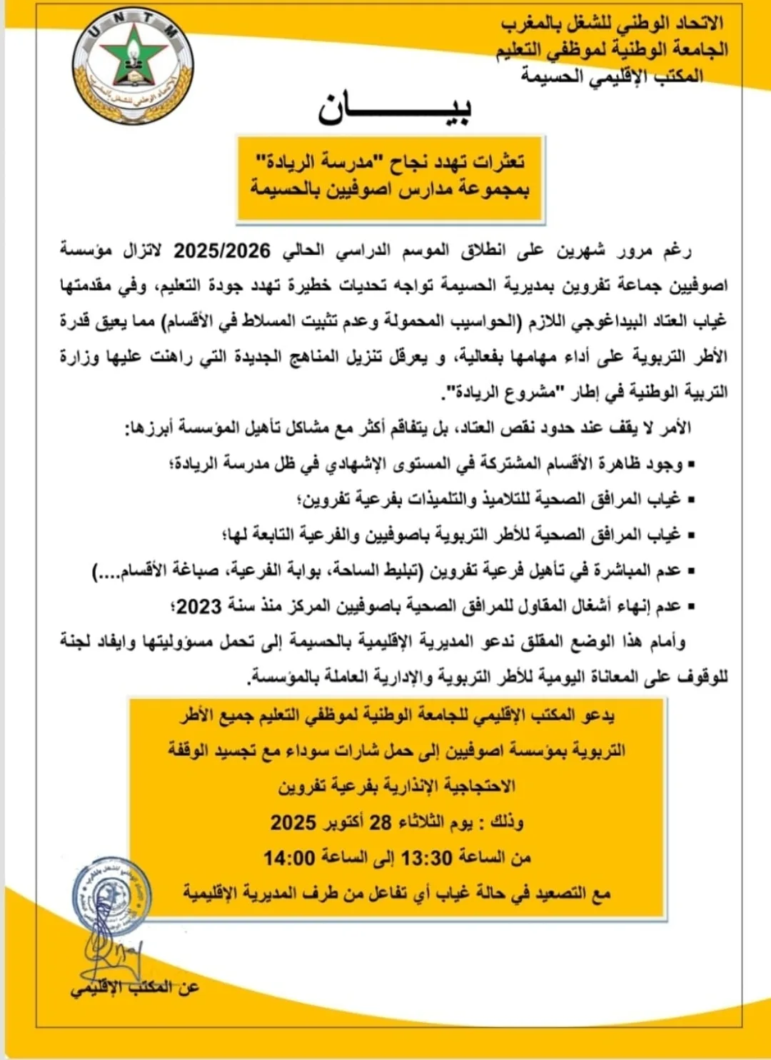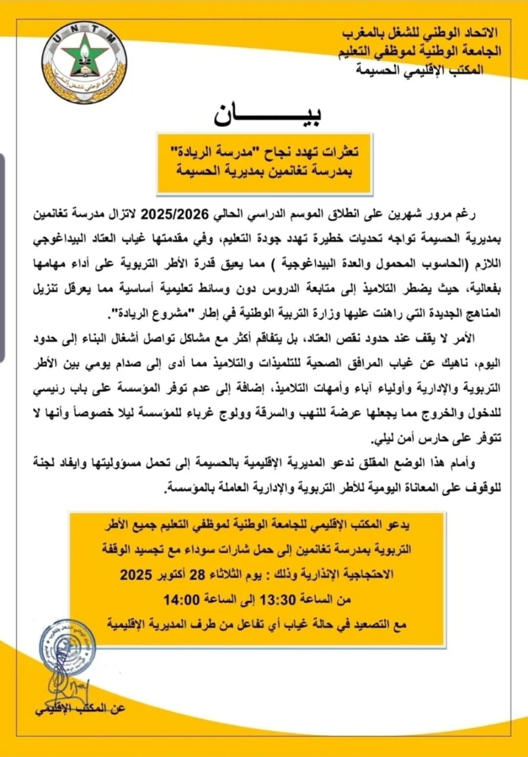 وأوضح بيان النقابة أن المؤسستين تعانيان من تراجع مقلق على المستويين التربوي والبنيوي، مشيرًا إلى أن الطاقم التربوي يشتكي من غياب ظروف عمل ملائمة وسوء تدبير المرحلة الانتقالية المواكبة لمشروع “مدارس الريادة”، ما انعكس سلبًا – حسب البيان – على جودة التعلمات وسير العملية التعليمية.