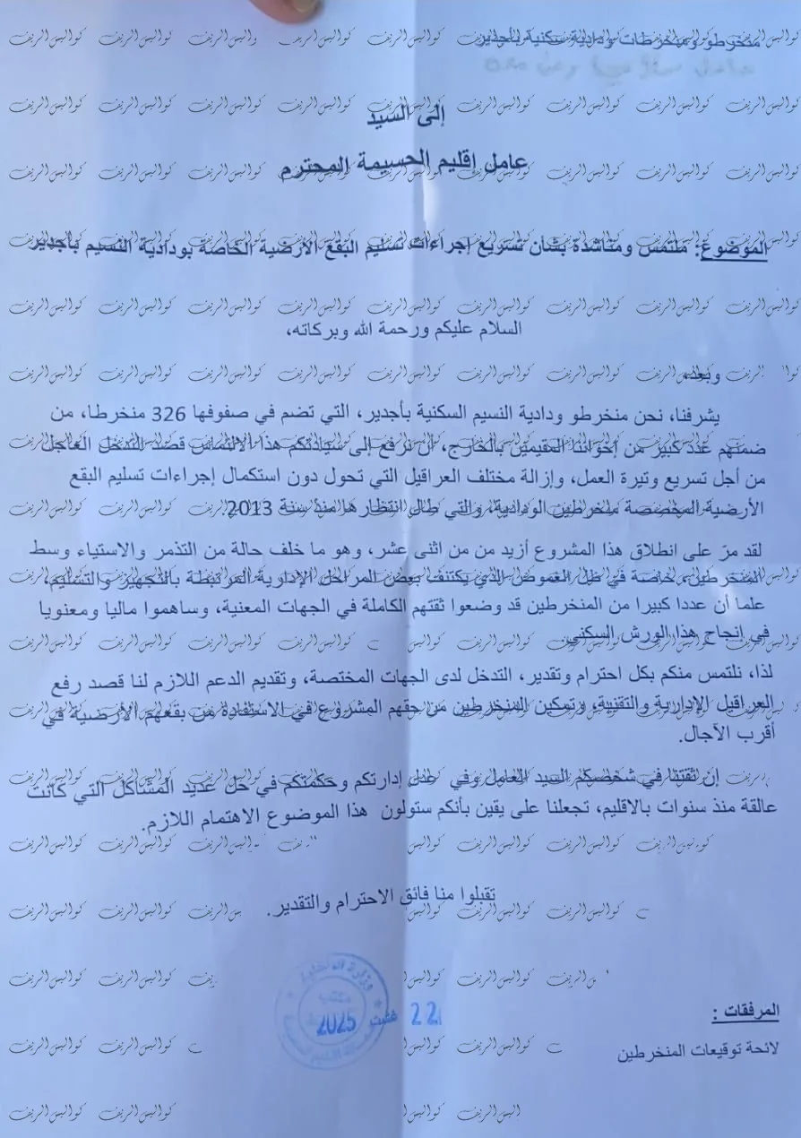 ورغم أن المشروع يضم أكثر من 300 بقعة أرضية، فإنه ما يزال يعاني من غياب شبكة التطهير السائل، في وقت تتجاوز فيه نسبة الأسر المحرومة من هذه الخدمة الحيوية 70% من ساكنة أجدير، ما يجعل الوضع الصحي للسكان مهدداً في أية لحظة.