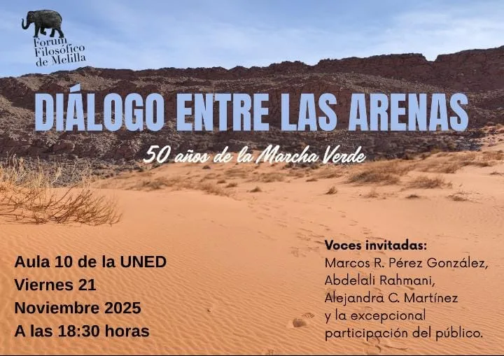 تنظّم يوم الجمعة المقبل بمدينة مليلية ندوة فكرية تحت عنوان “حوار بين الرمال – 50 سنة على المسيرة الخضراء” بقاعة “أولا 10” التابعة لجامعة التعليم عن بُعد (UNED).