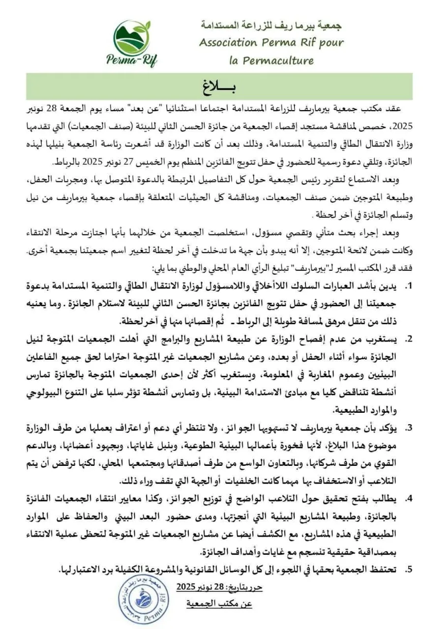 في تطوّر غير مسبوق داخل المشهد البيئي الوطني، خرجت جمعية پيرما ريف للزراعة المستدامة ببلاغ ناري، كشفت فيه تفاصيل ما وصفته بـ الارتباك غير المبرّر في طريقة تدبير وزارة الانتقال الطاقي والتنمية المستدامة لجائزة “الحسن الثاني للبيئة”، والتي أعلنت الوزارة عن منحها لإحدى الجمعيات دون تقديم أدنى توضيحات موضوعية أو معلومات رسمية حول معايير الاختيار.