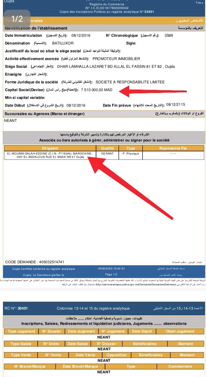 من بين الوثائق المثيرة، عملية شراء قطعة أرضية تقارب قيمتها ملياري سنتيم باسم إحدى شركات المومني “Batiluxor”، رغم أن رأسمالها – حسب عقد الشراء المحرّر لدى الموثقة – لا يتعدى 10 آلاف درهم.
