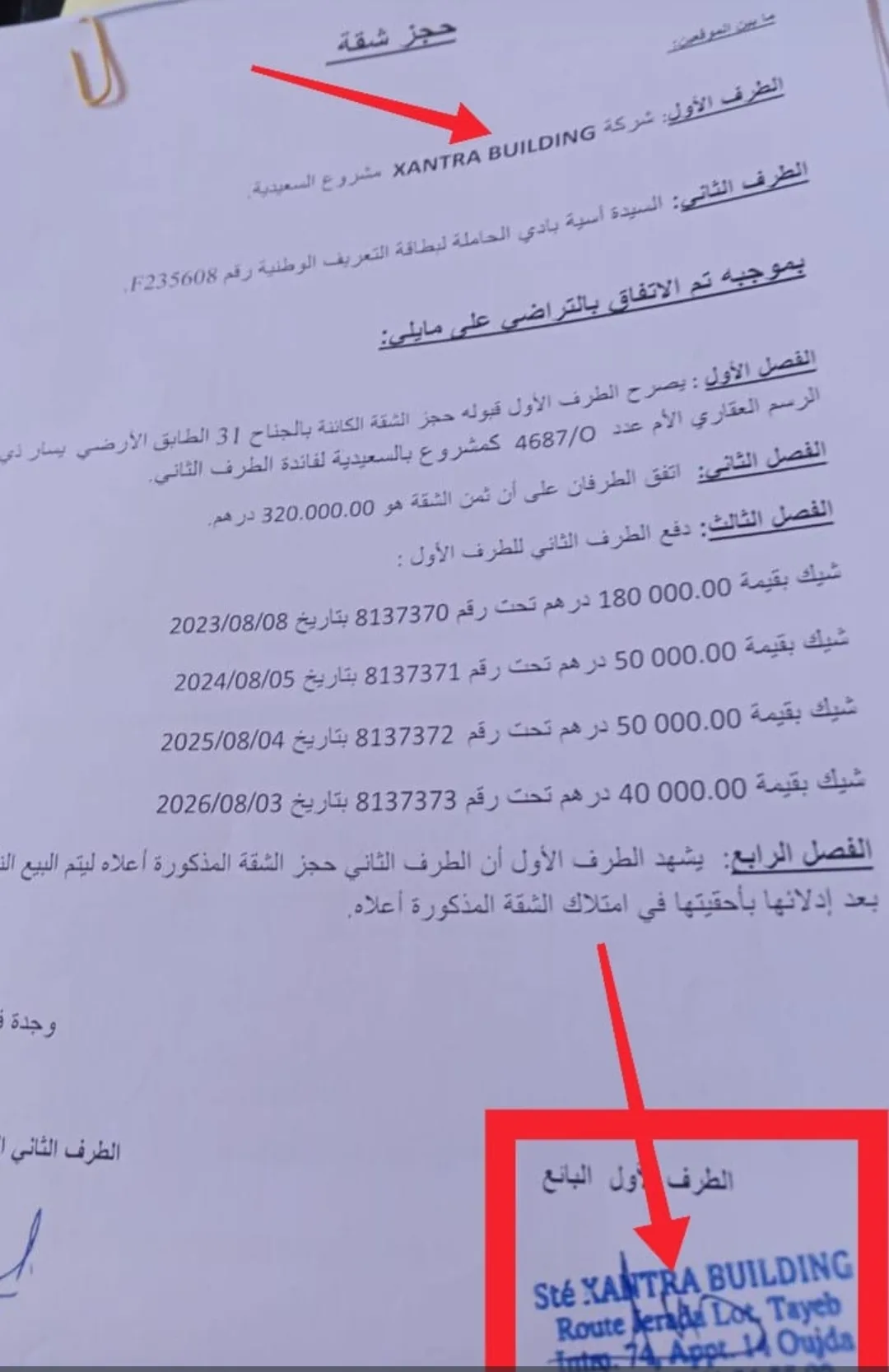 ومن بين ما أثار الانتباه أيضاً، وعود بيع تتعلق بشركة تحمل اسم “Oum Al Qoura L’Iskan”، تُنسب ملكيتها لشخص يدعى عبد الله ربحي. وتفيد وثائق اطّلعت عليها الجريدة ـ دون الجزم بصحتها النهائية في انتظار الخبرة ـ بأن التوقيع على بعض هذه الوثائق كان يتم من طرف المقاول المعني أو عبر ختم شركة “Xantra”، في ما قد يشكل، إن ثبت، خرقاً صريحاً لقانون الالتزامات والعقود.