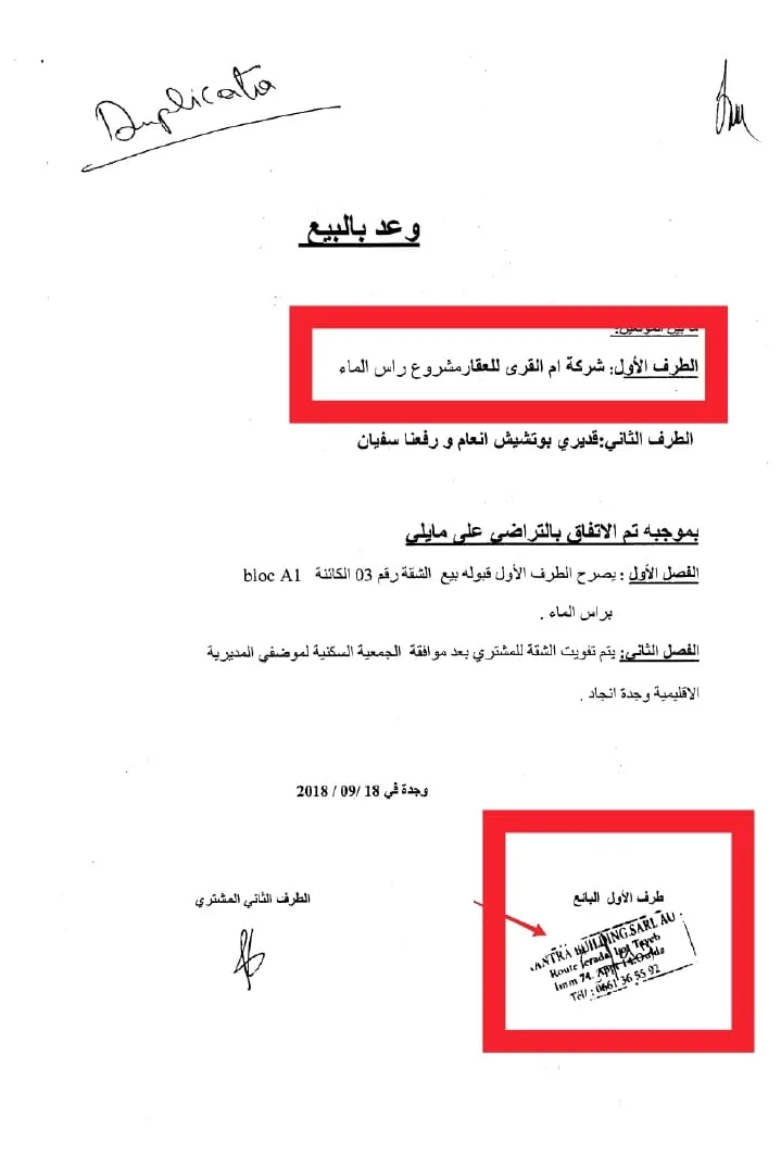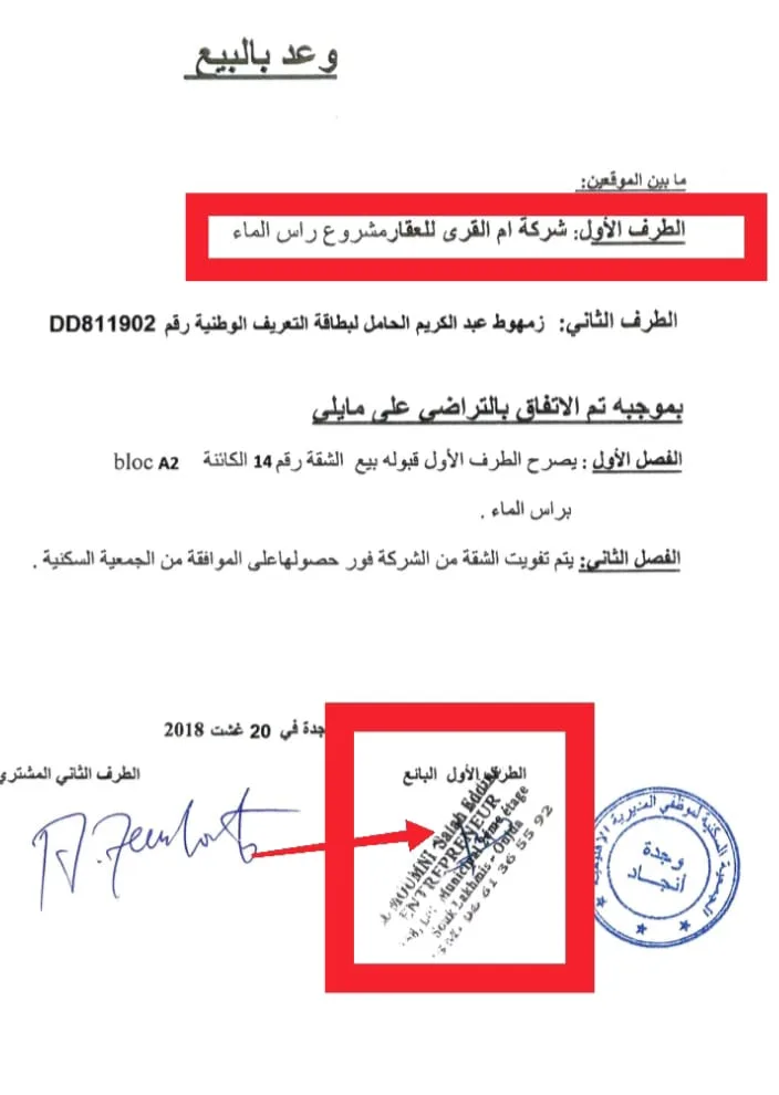 ومن بين ما أثار الانتباه أيضاً، وعود بيع تتعلق بشركة تحمل اسم “Oum Al Qoura L’Iskan”، تُنسب ملكيتها لشخص يدعى عبد الله ربحي. وتفيد وثائق اطّلعت عليها الجريدة ـ دون الجزم بصحتها النهائية في انتظار الخبرة ـ بأن التوقيع على بعض هذه الوثائق كان يتم من طرف المقاول المعني أو عبر ختم شركة “Xantra”، في ما قد يشكل، إن ثبت، خرقاً صريحاً لقانون الالتزامات والعقود.