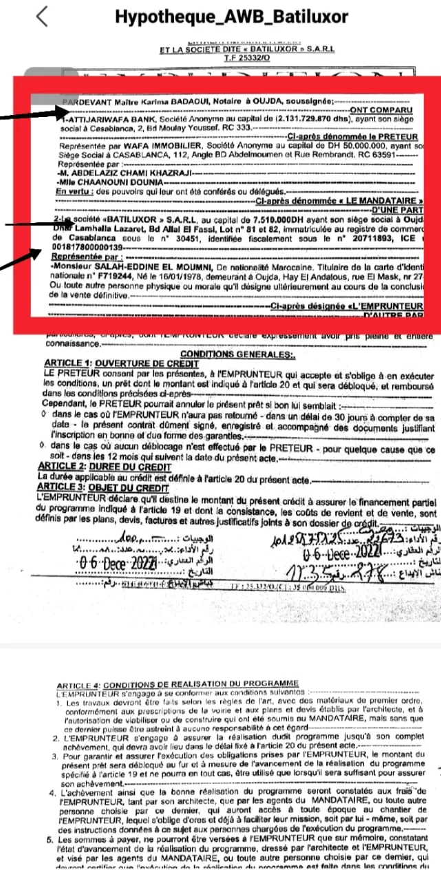 ويشير التقرير ذاته إلى أن الضمانات المقدمة للبنك المذكور لا تعود ملكيتها الحقيقية إلى المقاول، بل إلى المستفيدين والمنخرطين الذين سبق لهم أداء مبالغ مالية مهمة على شكل دفوعات، وهو ما يكشف، بحسب خلاصات التقرير، عن اختلالات جسيمة في مسطرة منح القرض، وتحايلاً محتملاً على القوانين المنظمة للتمويل البنكي.
