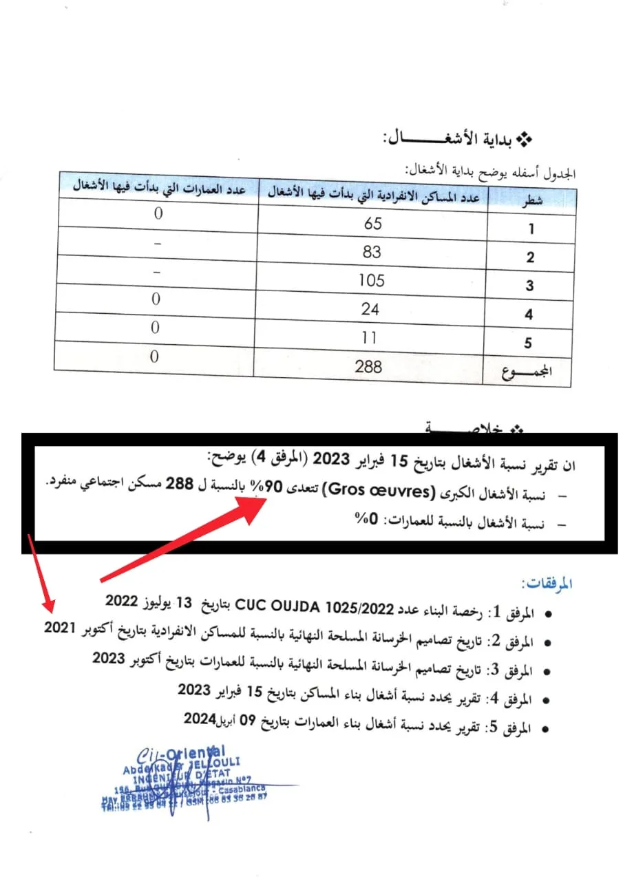 وفي تطور بالغ الخطورة، كشف تقرير صادر عن مكتب دراسات مستقل، توصلت الجريدة بنسخة منه، أن المشروع السكني موضوع القرض كانت نسبة تقدم الأشغال به تقارب تسعين في المائة، وكان محل اتفاق سابق مع جمعية تعليمية تُعد المالكة الأصلية لمشروع البناء، ما يعني أن القرض البنكي مُنح لمشروع قائم في الأصل وليس لمشروع في طور الإنجاز كما هو مفترض في مثل هذه العمليات.