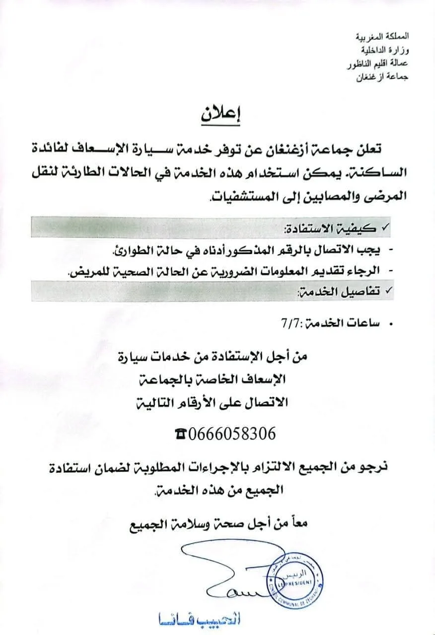 أعلنت جماعة أزغنغان عن إطلاق خدمة سيارة الإسعاف لفائدة المواطنين، بهدف نقل المرضى والمصابين إلى المؤسسات الاستشفائية في الحالات الطارئة. تأتي هذه المبادرة ضمن ما وصفه أحد المسؤولين ، بجهود الجماعة لتعزيز خدمات القرب وضمان صحة وسلامة الجميع.