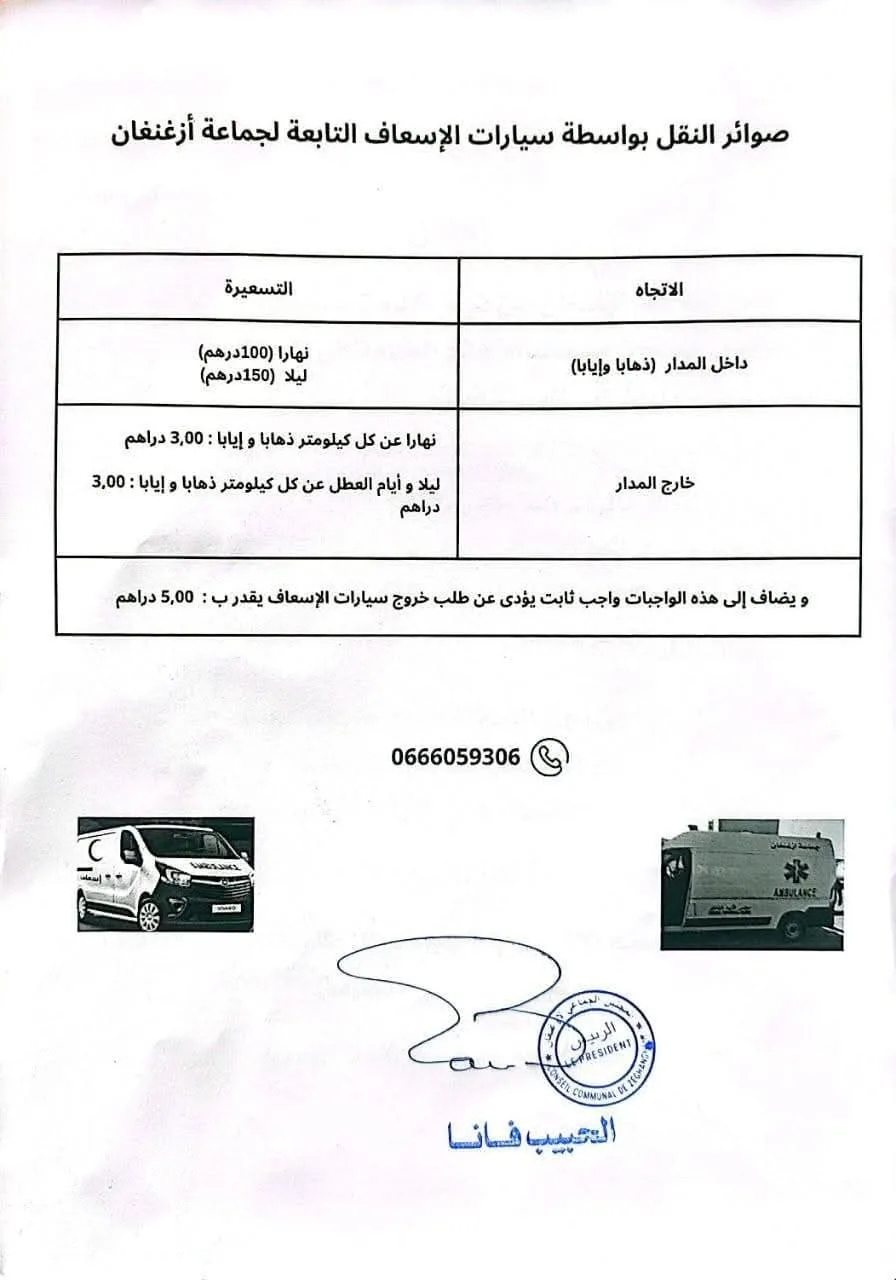 أما فيما يخص تعريفة النقل، فقد حددت الجماعة الأسعار كالآتي: داخل المدار، 100 درهم نهارًا و150 درهم ليلًا؛ وخارج المدار، 3 دراهم لكل كيلومتر ذهابًا وإيابًا خلال النهار، ونفس السعر خلال الليل وأيام العطل، مع رسوم ثابتة قدرها 5.00 دراهم عند طلب خروج سيارة الإسعاف.