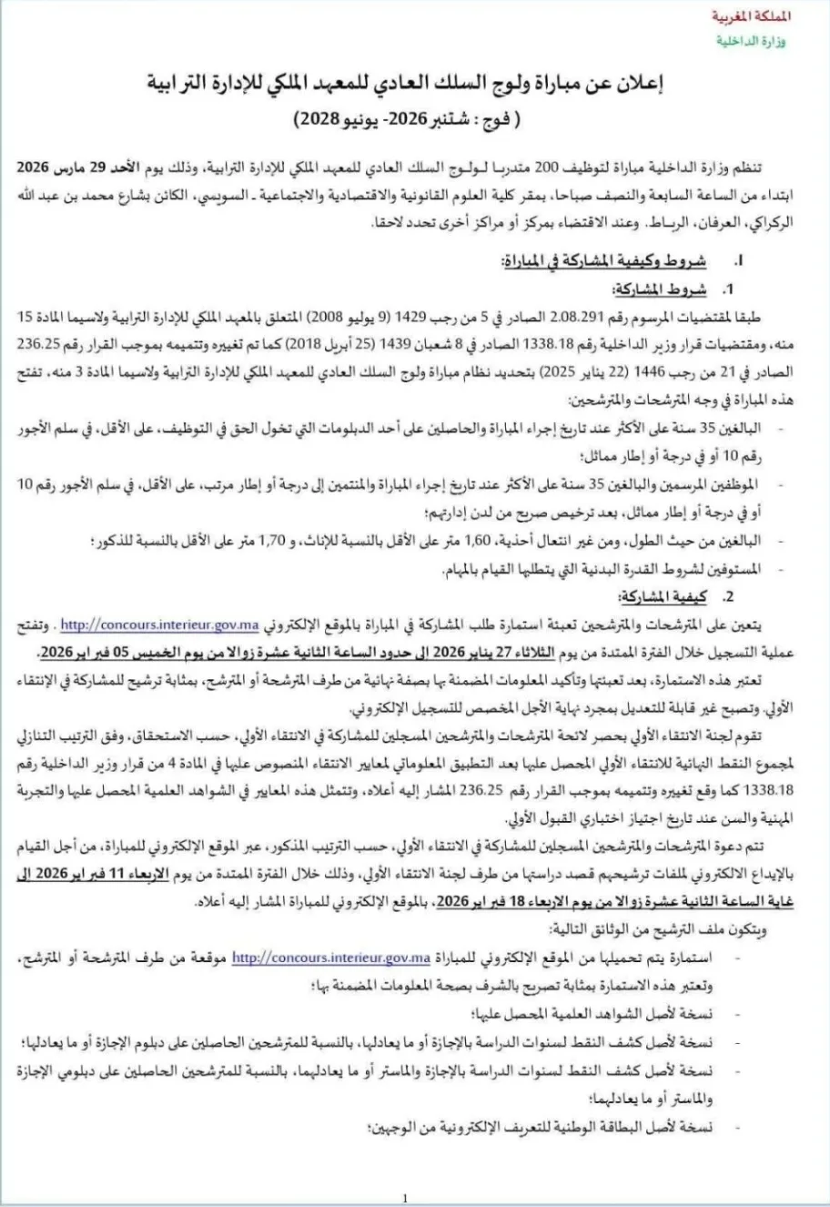 كشفت وزارة الداخلية عن إطلاق مباراة جديدة لولوج السلك العادي بالمعهد الملكي للإدارة الترابية برسم سنة 2026، في خطوة تروم تعزيز صفوف الإدارة الترابية بـ200 قائد متدرب، سيتم إعدادهم للاضطلاع بمهام المسؤولية الميدانية.