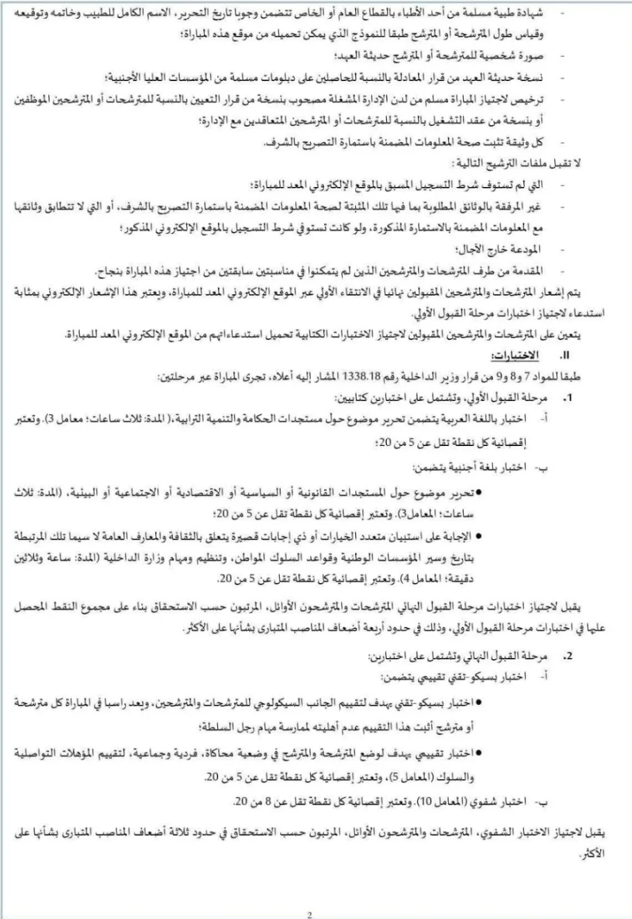 وستمر المباراة عبر مراحل متعددة، تشمل اختبارات كتابية وشفوية دقيقة، ترمي إلى قياس المؤهلات العلمية، والقدرات النفسية، والاستعدادات القيادية للمترشحين، وفق ضوابط ومعايير مضبوطة تشرف عليها الوزارة.