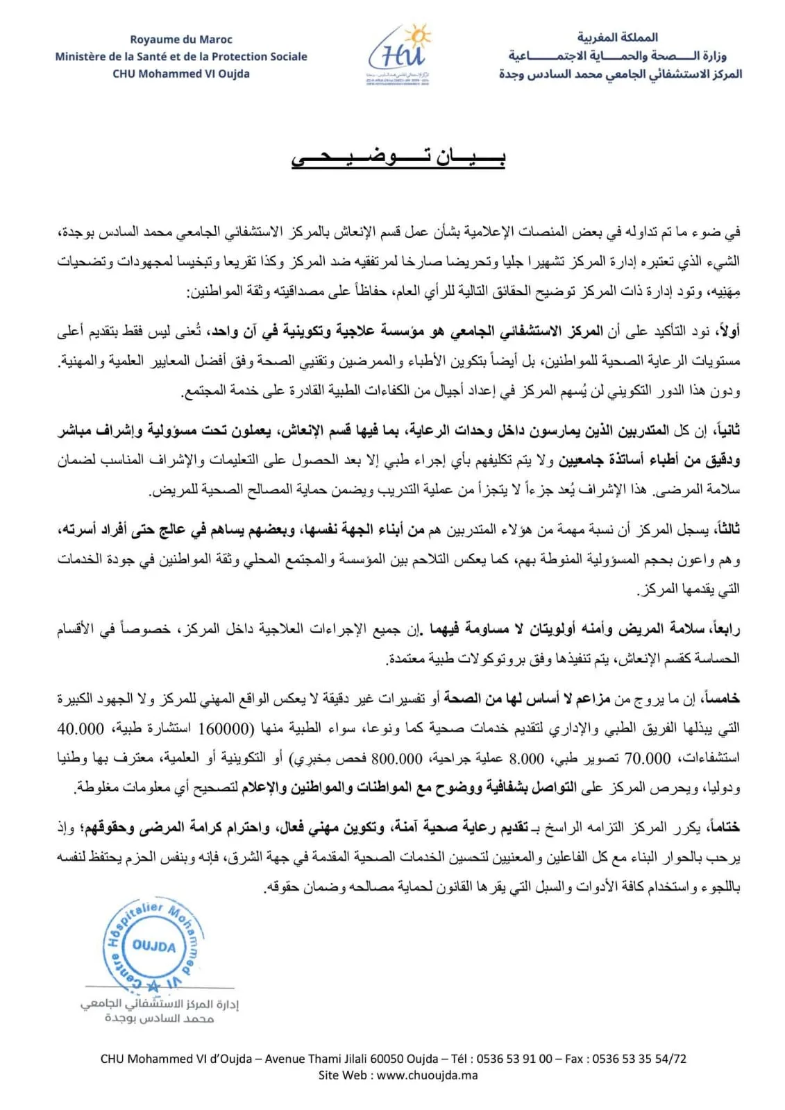 وفي ردها على ما تم تداوله من مزاعم، اعتبرت إدارة المركز أن هذه الادعاءات لا تعكس الواقع المهني اليومي للمؤسسة، ولا تأخذ بعين الاعتبار حجم المجهودات المبذولة، مشيرة إلى أن المستشفى يقدم سنوياً أرقاماً مهمة من الخدمات الصحية، من بينها أزيد من 160 ألف استشارة طبية، و40 ألف حالة استشفاء، و70 ألف عملية تصوير طبي، و8 آلاف عملية جراحية، إضافة إلى حوالي 800 ألف فحص مخبري، فضلاً عن أدواره التكوينية والعلمية المعترف بها وطنياً ودولياً.