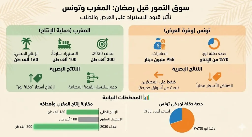 أثار قرار المغرب تقييد استيراد التمور، في خطوة تهدف إلى حماية وتثمين الإنتاج المحلي، موجة قلق واسعة داخل الأوساط الفلاحية والتجارية في تونس، التي تعد ثاني أكبر مصدر للتمور في العالم. ويكتسي هذا التوتر بعدا خاصا لتزامنه مع اقتراب شهر رمضان، الذي يشهد ذروة استهلاك هذا المنتوج في البلدين. فالمغرب يشكل المنفذ التصديري الأول للتمور التونسية، ما يجعل أي تضييق على الولوج إلى سوقه ذا انعكاسات مباشرة على قطاع يوفر مورد عيش لآلاف العائلات، ويمثل إحدى ركائز الصادرات الفلاحية التونسية.