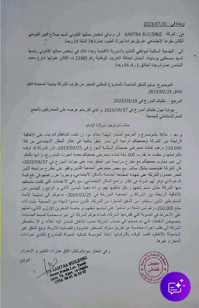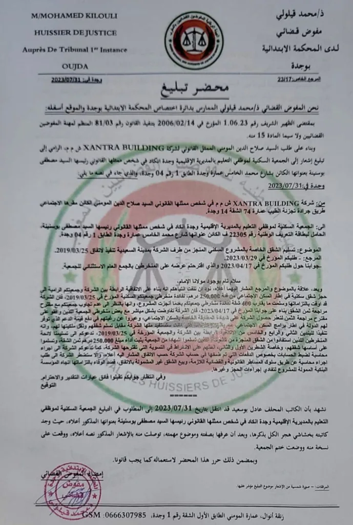 وتُبرز التحريات دور صلاح الدين المومني بصفته الممثل القانوني لشركة XANTRA BUILDING، حيث قدّم المشروع للجمعية على أنه مدعوم، قبل أن يقترح لاحقًا تسعير المتر المربع بنحو 6600 درهم، ثم شرع في محاولات فسخ العقود، في خطوة اعتُبرت استغلالًا للجمعية باسم الدعم العمومي. غير أن محكمة العقار رفضت طلب الفسخ، وألزمت الشركة بإتمام التزاماتها وتسليم الشقق وتمكين المستفيدين من الرسوم العقارية، في حكم قضائي شكّل نقطة تحول حاسمة في الملف.