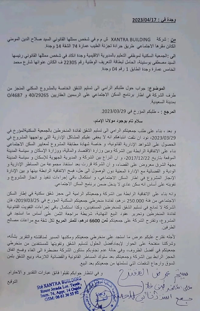 غير أن الأدلة الموثقة التي تحصلت عليها الجريدة، تؤكد أن تلك “الاتفاقيات” لم تكن ترخيصًا خاصًا بالمشروع ولا دليلًا على إدراجه ضمن برامج السكن الاجتماعي، بل مجرد إطار عام لمزايا المنعشين العقاريين دون ضمان استيفاء الشروط القانونية والتقنية. كما تُظهر الوثائق أن ملف المشروع لم يُودَع لدى المصالح المختصة كسكن اجتماعي، وأن رخصة البناء صنّفته سكنًا اقتصاديًا، وهو معطى جوهري تم تجاوزه أثناء التسويق، ما أوقع الجمعية في الغلط.
