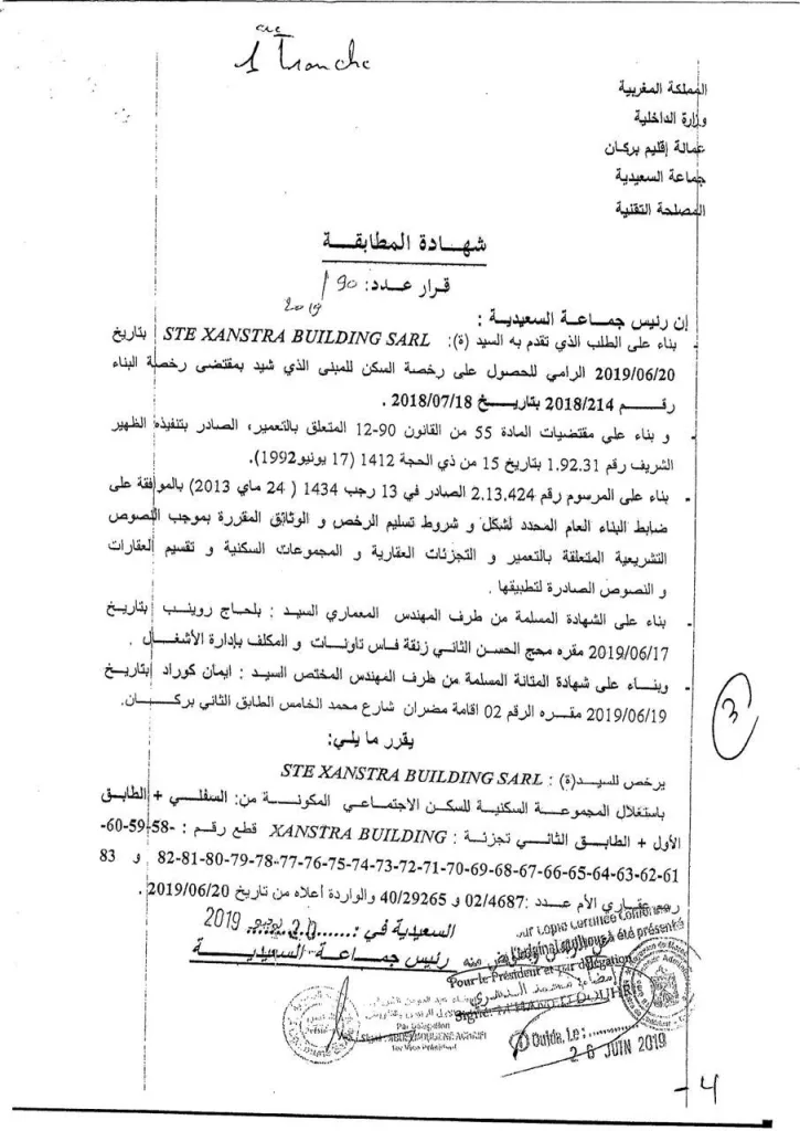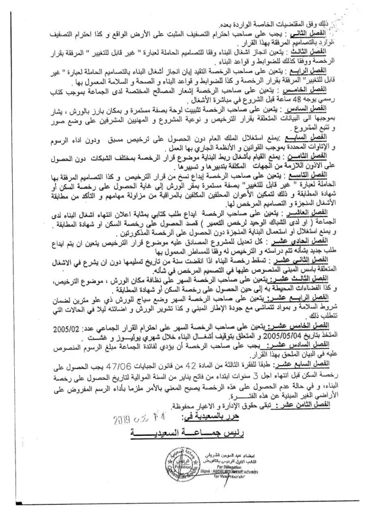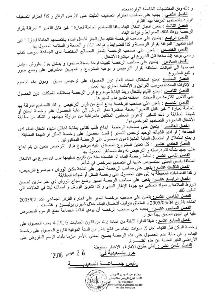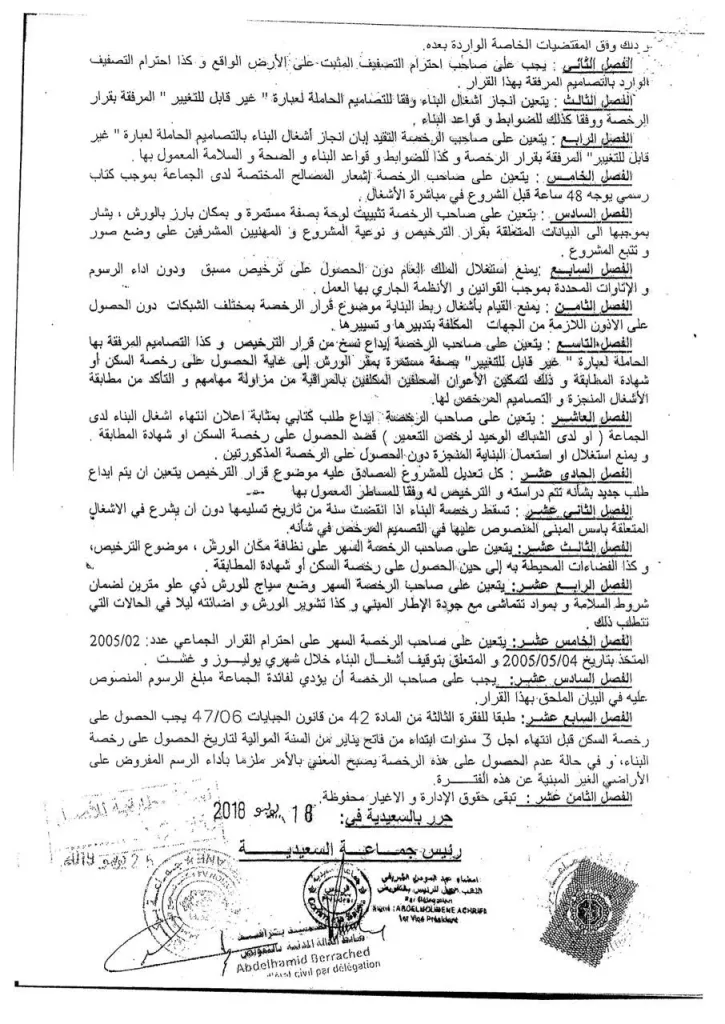 غير أن مراسلات لاحقة صادرة عن المديرية الجهوية للإسكان كشفت تناقضًا واضحًا، حيث تم رفض تسليم شهادة المطابقة للمشروع بعلة أنه لا يدخل ضمن تصميم التهيئة لجماعة السعيدية المخصص للسكن الاجتماعي، وفق قرار لجنة التعمير المؤرخ في 22 ماي 2018.