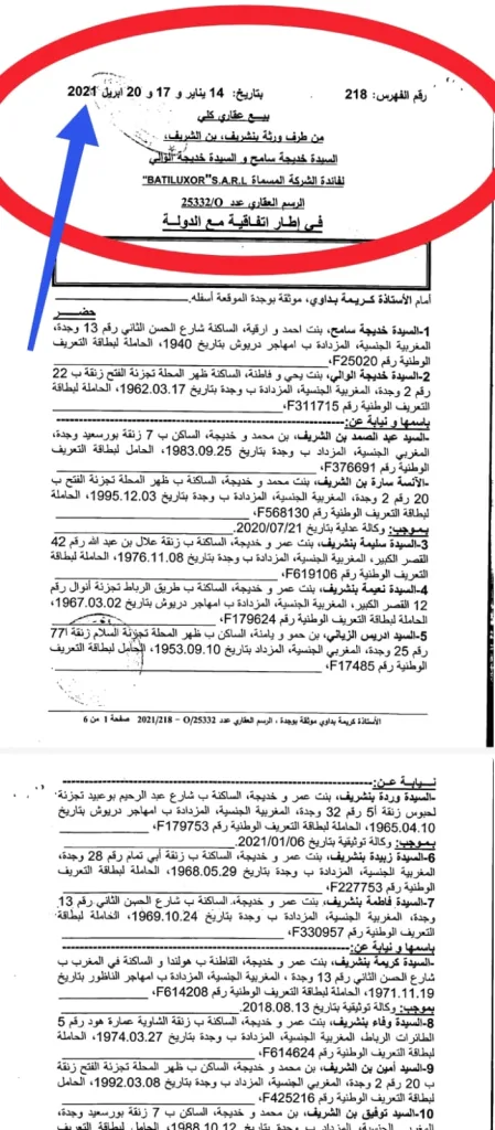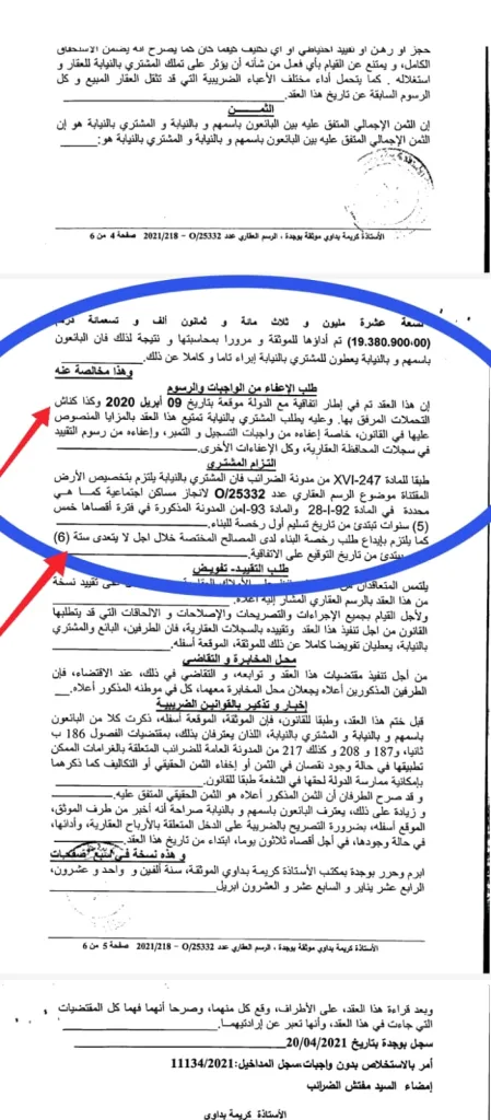 كما سجلت الموثقة في عقد شراء العقار (الرسم العقاري 25332/0) بنداً ينص على الاستفادة من إعفاءات ضريبية، وهو امتياز مشروط قانوناً باحترام الآجال والإجراءات، ما يعزز الشكوك حول محاولة إضفاء صبغة قانونية على مشروع غير مستوفٍ للشروط.