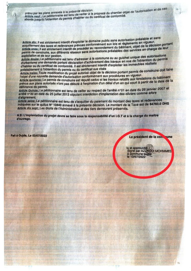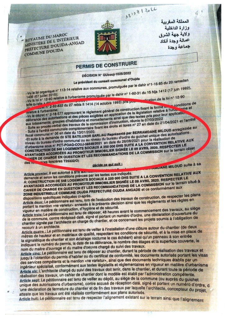 تكشف الوثائق أن رخصة البناء رقم 1025/2022، المسلمة لفائدة شركة Batiluxor من طرف جماعة وجدة، تخص مشروع مجموعة سكنية اجتماعية مؤطرة ب “اتفاقية مع وزارة إعداد التراب الوطني والتعمير والإسكان وسياسة المدينة ووزارة الاقتصاد والمالية” .
