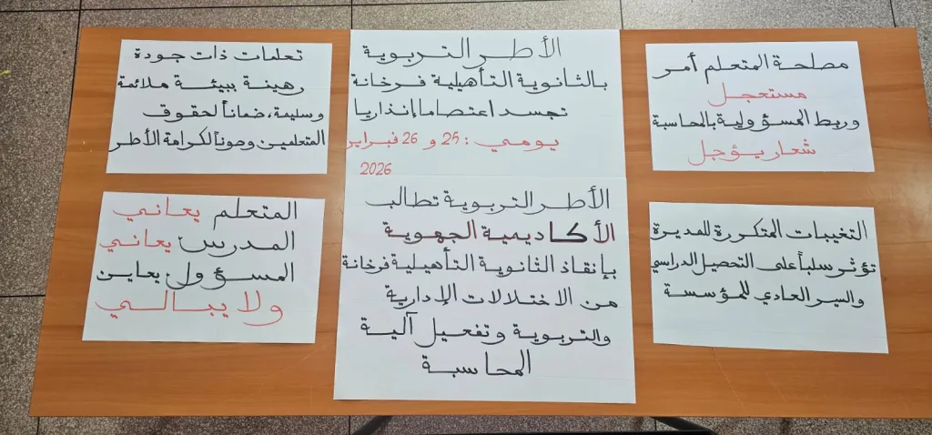 وطالب التنسيق النقابي الجهات الوصية، وعلى رأسها المديرية الإقليمية ووزارة التربية الوطنية، بفتح تحقيق نزيه وعاجل حول هذه الاتهامات، واتخاذ الإجراءات الكفيلة بضمان ظروف عمل كريمة تحفظ كرامة نساء ورجال التعليم، وتؤمّن مناخًا تربويًا سليمًا للمتعلمين.