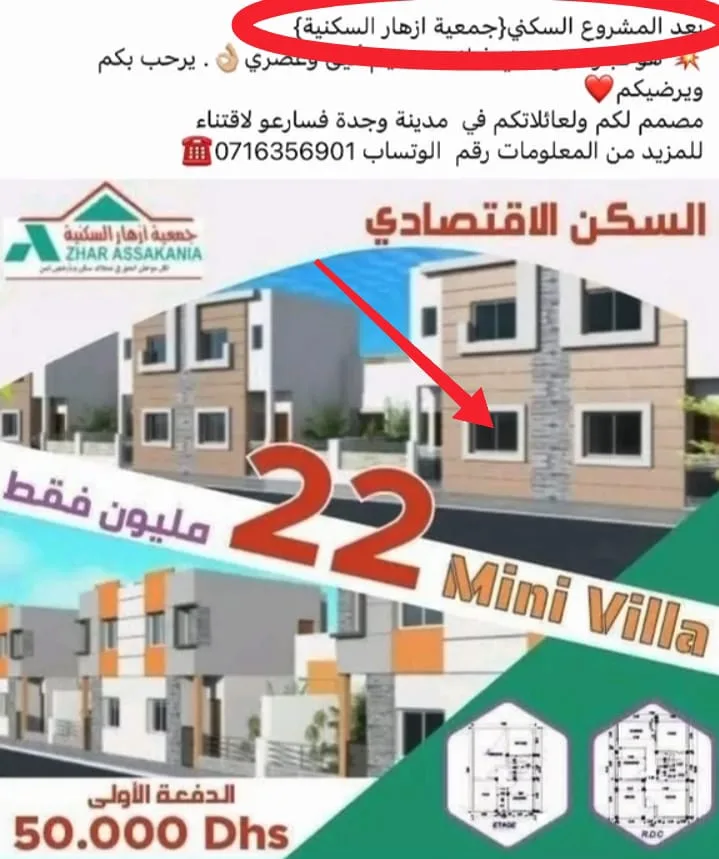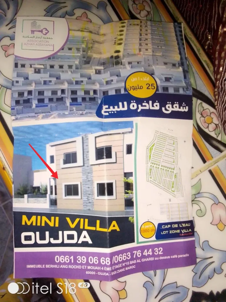 المعطيات التي توصلت بها “كواليس الريف” تشير إلى أن الجمعية، التي تحمل اسم جمعية أزهار السكنية، شرعت منذ نحو سنتين في حملة إعلانية لتسويق مشروع سكني اجتماعي، يُزعم أنه بقيمة 22 مليون للشقة … اللافت أن تصميم المشروع يشبه إلى حد التطابق مشروعًا سكنيًا آخرًا كان موضوع نزاع مع جمعية رجال التعليم بمدينة وجدة، ما يثير تساؤلات حول مدى جدية المشروع الجديد، وما إذا كان مجرد وهم على الورق يتم تسويقه بغرض جمع الأموال فقط.
