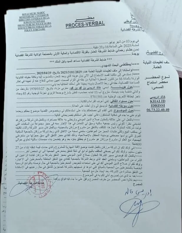 وحصلت جريدة “كواليس الريف” في إطار تحقيق استقصائي للوقوف على الحقيقة وتنوير العدالة على محضر استماع للسلفي خالد الإدريسي، الذي نفى نفياً قاطعاً أي علاقة له بالمعاملات العقارية المخالفة للقانون التي يقوم بها صهره المقاول صلاح الدين المومني ، مؤكدًا أنه بعيد كل البعد عن أي عملية تسويق أو بيع متعلقة بالمشاريع المتعاقد عليها مع الجمعية السكنية لرجال التعليم الشرق، وأن نشاطه يقتصر على مشروع على الورق لا علاقة له بالجمعية ولا بمدن وجدة أو السعيدية أو رأس الماء.