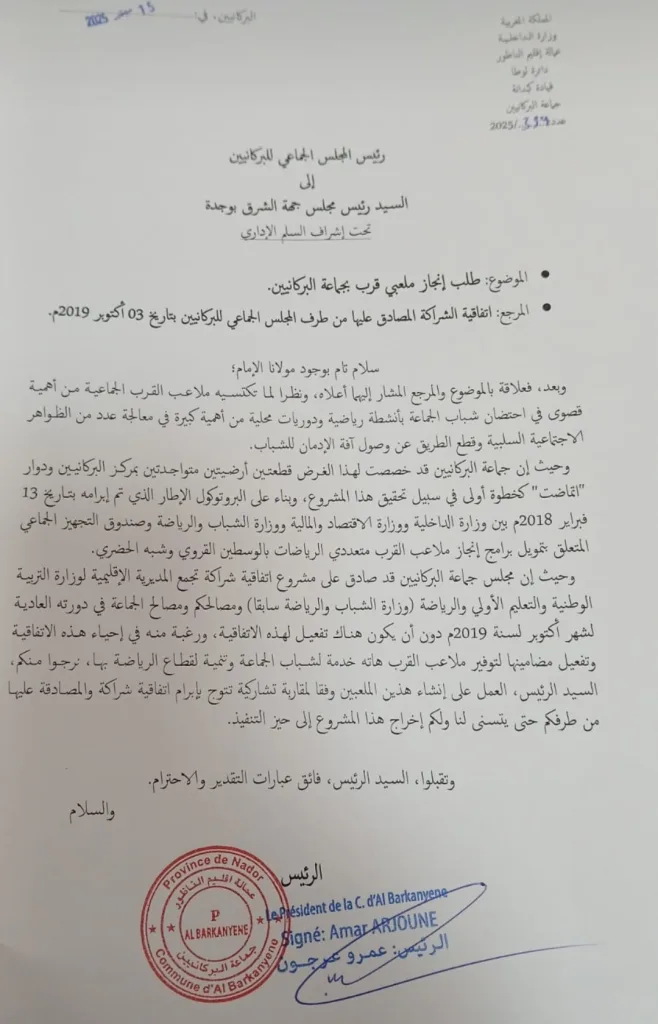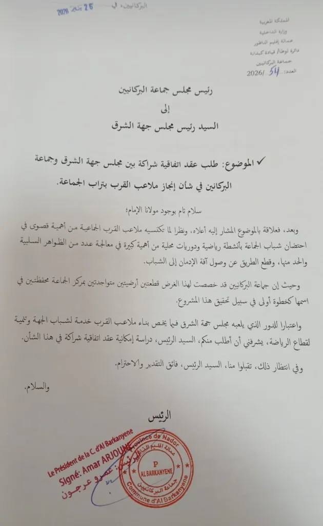 وفي هذا السياق، أفاد رئيس الجماعة بأن مسار الترافع عن المشروع انطلق من خلال مراسلة وُجهت إلى رئيس مجلس جهة الشرق بتاريخ 15 شتنبر 2025، قبل أن يُطلب من الجماعة لاحقاً إرفاق الملف بشهادة التحفيظ العقاري، وهو الإجراء الذي تم استكماله بتاريخ 26 يناير 2026.