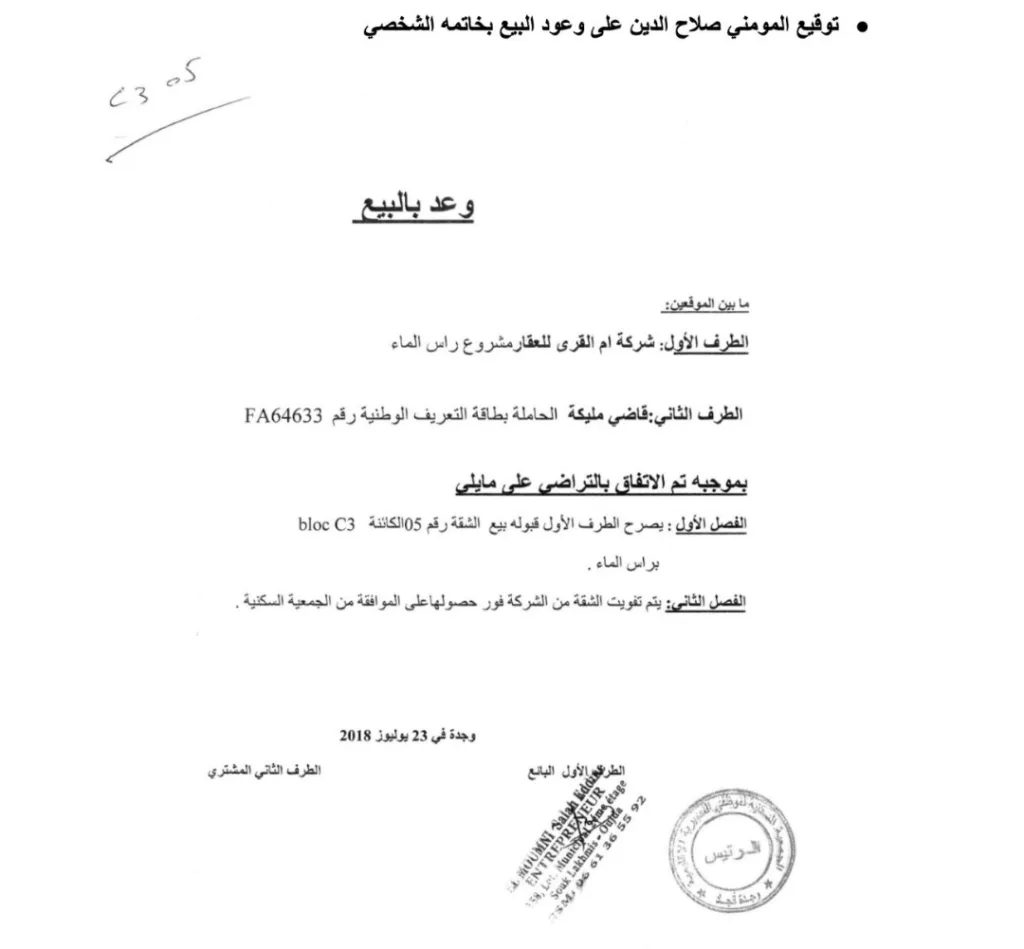 غير أن مسار التحقيق والوثائق التي ظهرت خلال مراحل البحث القضائي كشفت معطيات تطرح تساؤلات أوسع حول التسيير الفعلي للشركة، إذ تشير وثائق مرتبطة بعمليات بيع شقق ضمن المشروع السكني بجماعة رأس الماء إلى أن عدداً من وعود البيع تحمل توقيع المقاول صلاح الدين المومني أو ختم شركة “Xantra” التي تعود ملكيتها له، رغم أن الشركة المنجزة للمشروع والمسجلة رسمياً في الوثائق هي شركة “Oum Lqoura” المملوكة لعبد الله الرابحي.