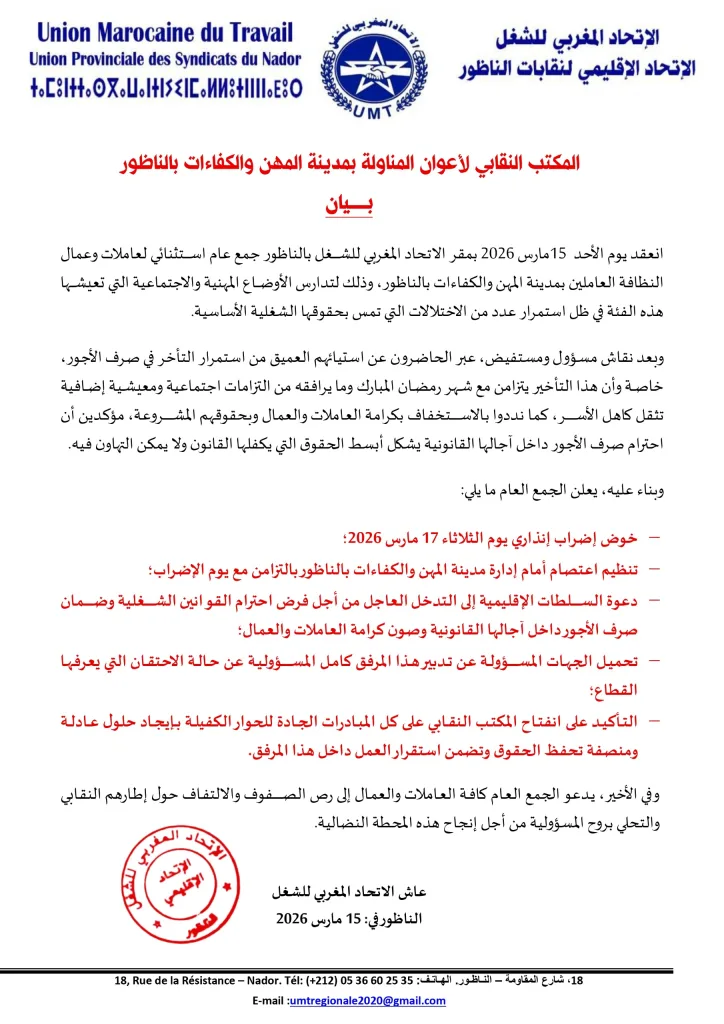 وجاء في بيان صادر عن الاتحاد الإقليمي لنقابات الناظور أن جمعاً عاماً انعقد يوم 15 مارس 2026 بمقر النقابة، خُصص لتدارس وضعية المستخدمين العاملين بشركة النظافة بمدينة المهن والكفاءات، حيث عبّر الحاضرون عن استيائهم العميق من استمرار التأخر في صرف الأجور، خاصة في ظرفية اجتماعية حساسة تتزامن مع شهر رمضان، وما يرافقه من أعباء معيشية إضافية تثقل كاهل الأسر.