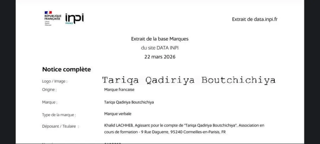 أثار تسجيل اسم “الطريقة القادرية البودشيشية” كعلامة تجارية في فرنسا نقاشاً واسعاً داخل بعض الأوساط الصوفية والإعلامية، وذلك عقب نشر وثائق صادرة عن المعهد الوطني للملكية الصناعية الفرنسي (INPI) بتاريخ 22 مارس 2026، تشير إلى تسجيل علامة تحمل اسم Tariqa Qadiriya Boutchichiya تحت رقم 5193380 لفائدة شخص بصفته وكيلاً عن جمعية قيد التأسيس.
