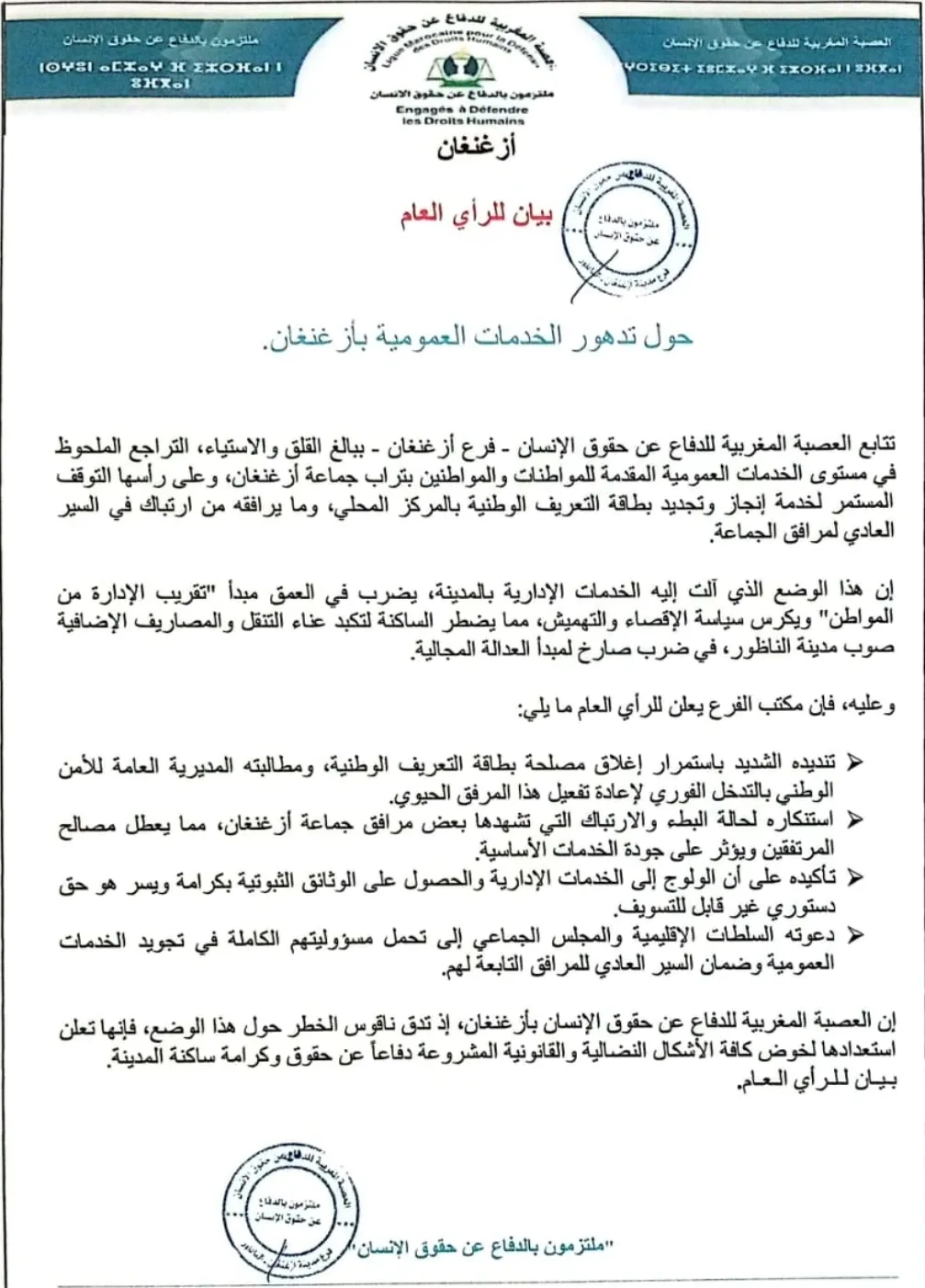 كما دعا المصدر نفسه السلطات الإقليمية والمجلس الجماعي إلى العمل على تجويد الخدمات وضمان انتظام عمل المرافق العمومية، مؤكداً أن الولوج إلى الخدمات الإدارية يعد من الحقوق الأساسية للمواطنين.