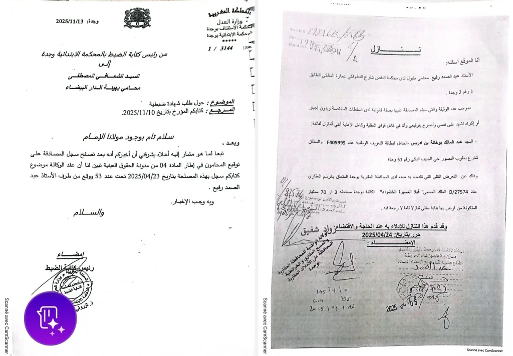 ويثير هذا المعطى، حسب مصادر مطلعة، علامات استفهام حول موقف إدارة المحافظة العقارية وطريقة تعاملها مع الوثيقتين المتناقضتين، خاصة أن مصلحة الضبط لدى المحكمة الابتدائية بوجدة أكدت أن عقد الوكالة موضوع الطعن تم تسجيله لديها بتاريخ 23 أبريل 2025 تحت عدد 53، بتوقيع المحامي المشتبه فيه (ع ـ ر)، وذلك وفق شهادة الضبط المؤرخة في 13 نونبر 2025.