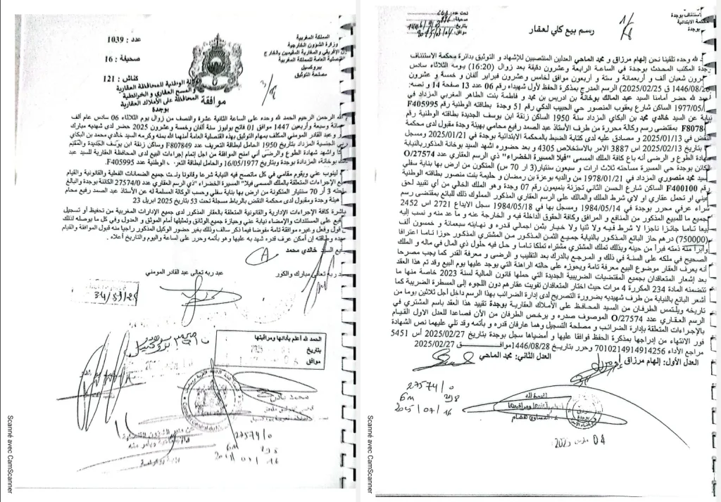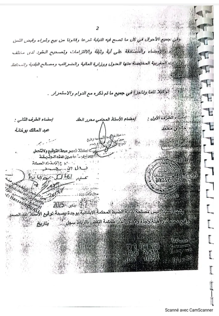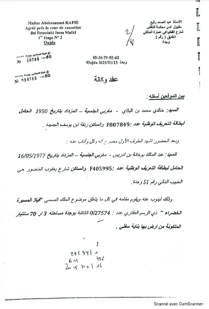 وحسب مضمون الوكالة، فإن الطرف الأول فوّض الطرف الثاني للنيابة عنه في جميع ما يتعلق بالملك المسمى “فيلا المسيرة الخضراء” ذات الرسم العقاري عدد 27574/O الكائنة بمدينة وجدة، بما في ذلك البيع والشراء وإنجاز مختلف الإجراءات الإدارية لدى المصالح المختصة.