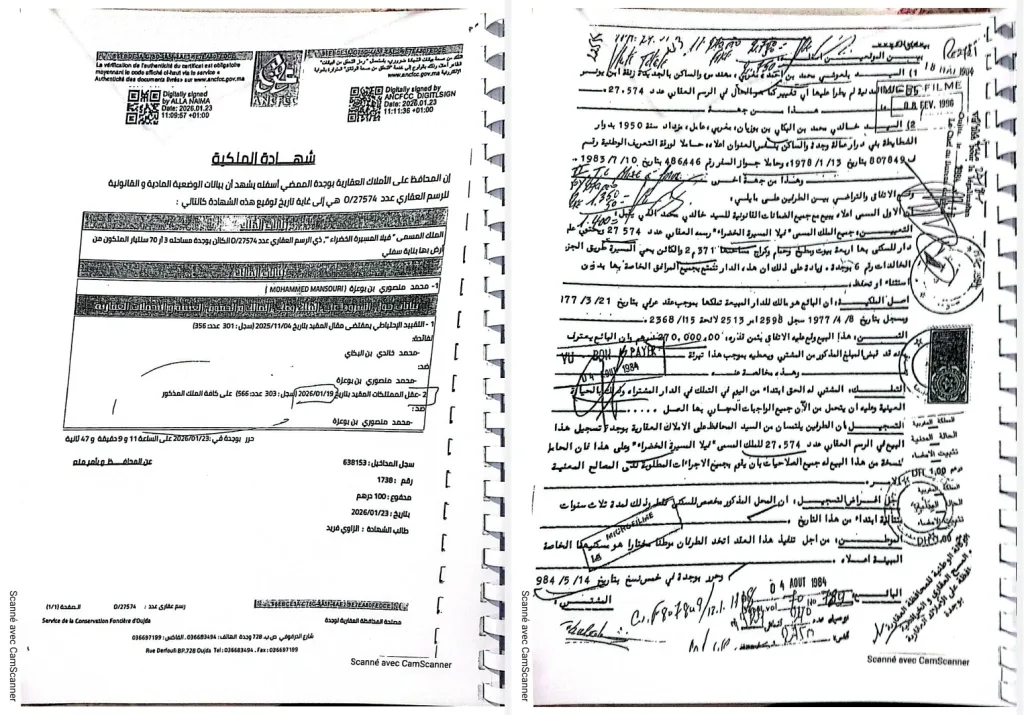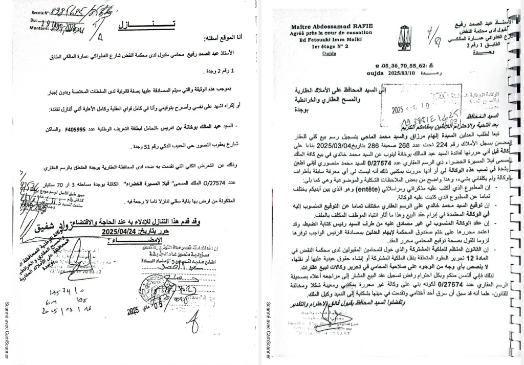 وكشفت وثائق ومعطيات حديثة عن تطورات لافتة في الملف، من بينها طعن تقدم به بتاريخ 10 مارس 2025 المحامي المتهم لدى المحافظة العقارية بوجدة ، شكك فيه في صحة عقد الوكالة المحرر بمكتبه بتاريخ 13 يناير 2025 لفائدة الضحية خالد محمد بن البكاي والمشتبه فيه (ع ـ ب)، سواء من حيث الشكل أو الموضوع.