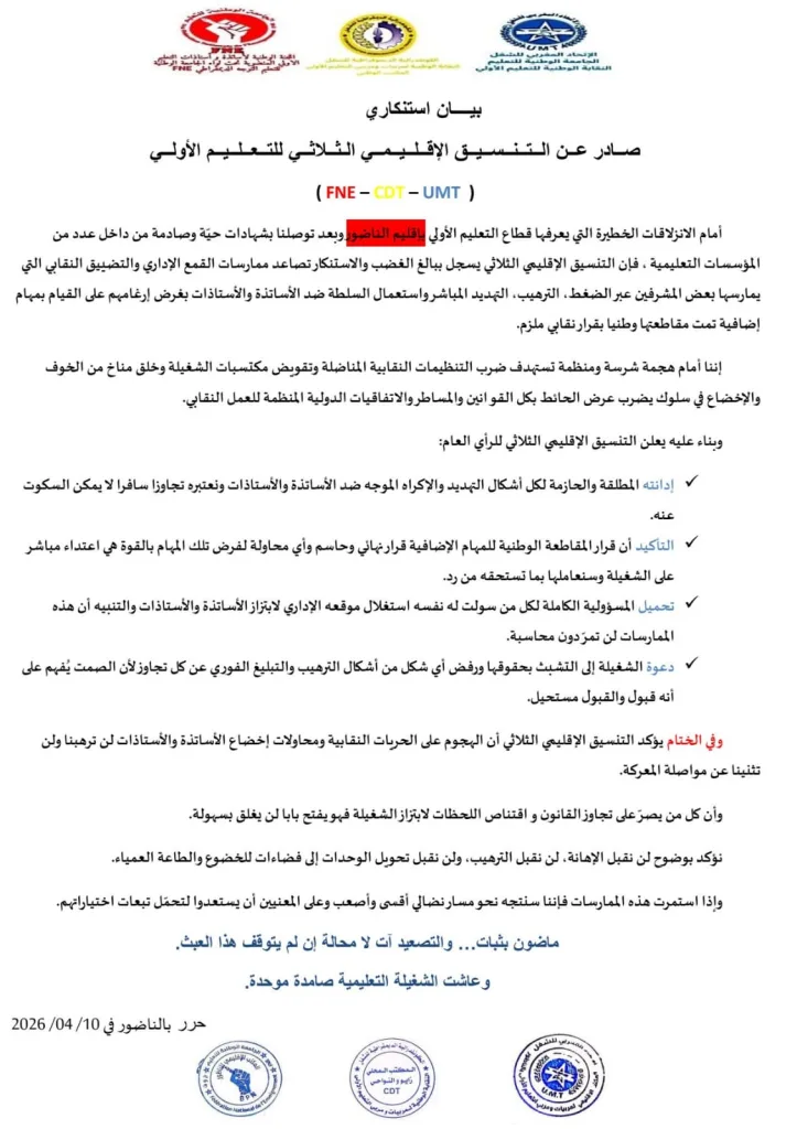 واعتبر التنسيق النقابي أن هذه الممارسات تشكل “هجوماً على التنظيمات النقابية” واستهدافاً لنشاطها النضالي، مؤكداً استمرار تصعيده في مواجهة ما وصفه بالضغط الممارس على الأطر التربوية في التعليم الأولي.