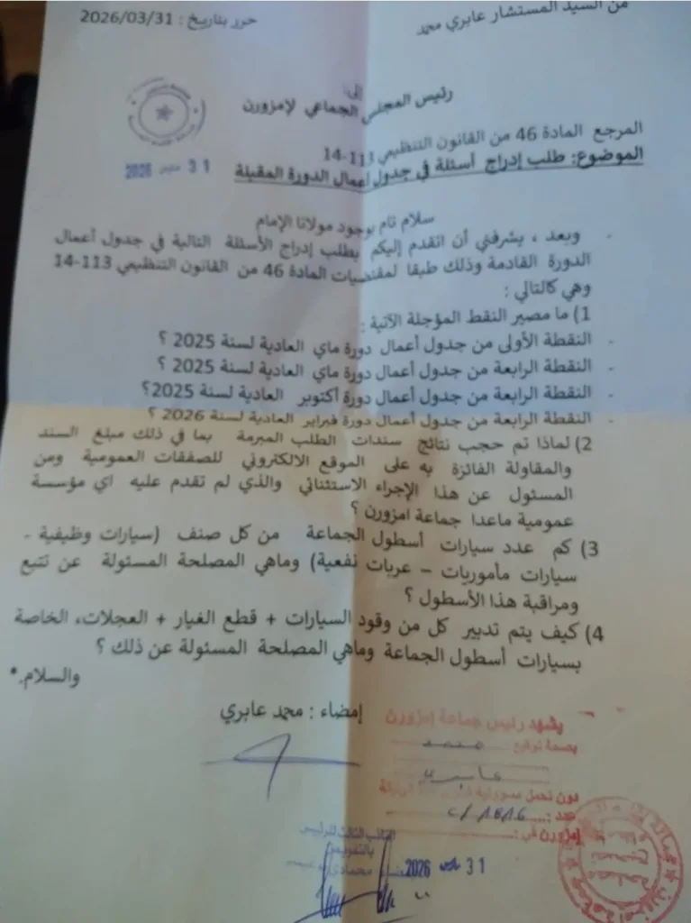 وجّه المستشار الجماعي بجماعة إمزورن، محمد عابري، المنتمي إلى صفوف المعارضة، مراسلة رسمية إلى رئيس المجلس الجماعي بتاريخ 31 مارس 2026، طالب فيها بإدراج عدد من النقاط ضمن جدول أعمال الدورة العادية لشهر ماي المقبل، وذلك استناداً إلى مقتضيات المادة 46 من القانون التنظيمي رقم 113.14 المتعلق بالجماعات الترابية.